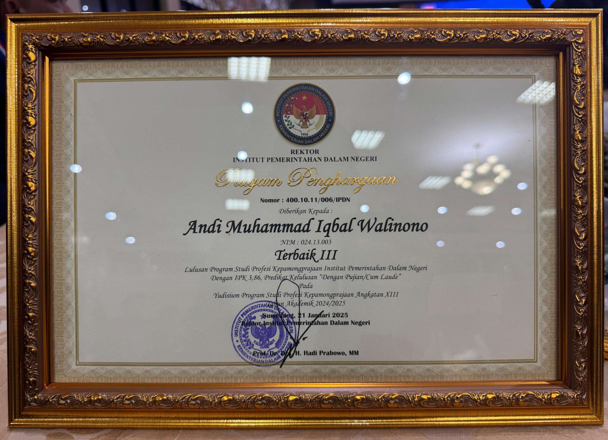 Penghargaan tersebut diserahkan pada acara Yudisium yang berlangsung di Kampus IPDN Jatinangor, Jawa Barat, Kamis (23/1/2025).