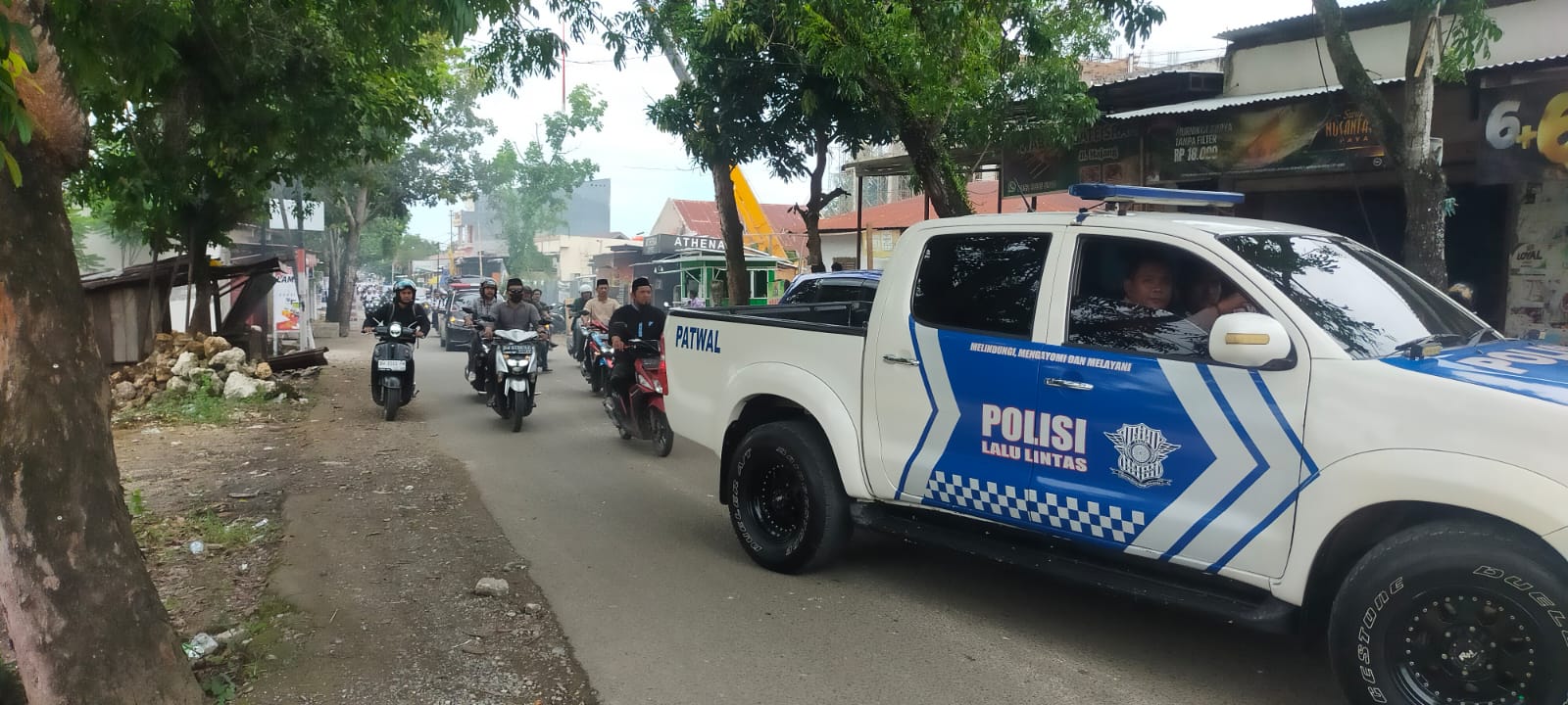 Personel memberi pengawalan terhadap iring-iringan, dari rumah duka di Jl Pisang Baru hingga rombongan sampai ke salah satu Tempat Pemakaman Umum di Kelurahan Majang.